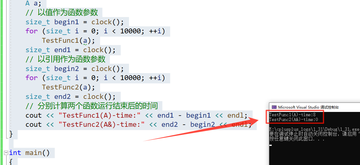 cout << "TestFunc2(A&)-time:" << end2 - begin2 << endl;