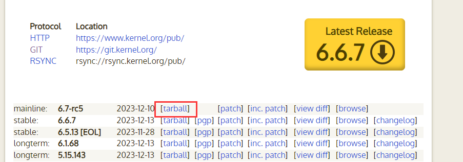 有了启动引导,接下来是移植 Linux 6.7 主线,前往 https://kernel.org/ 找到 Linux 6.7,选择 tarball 下载