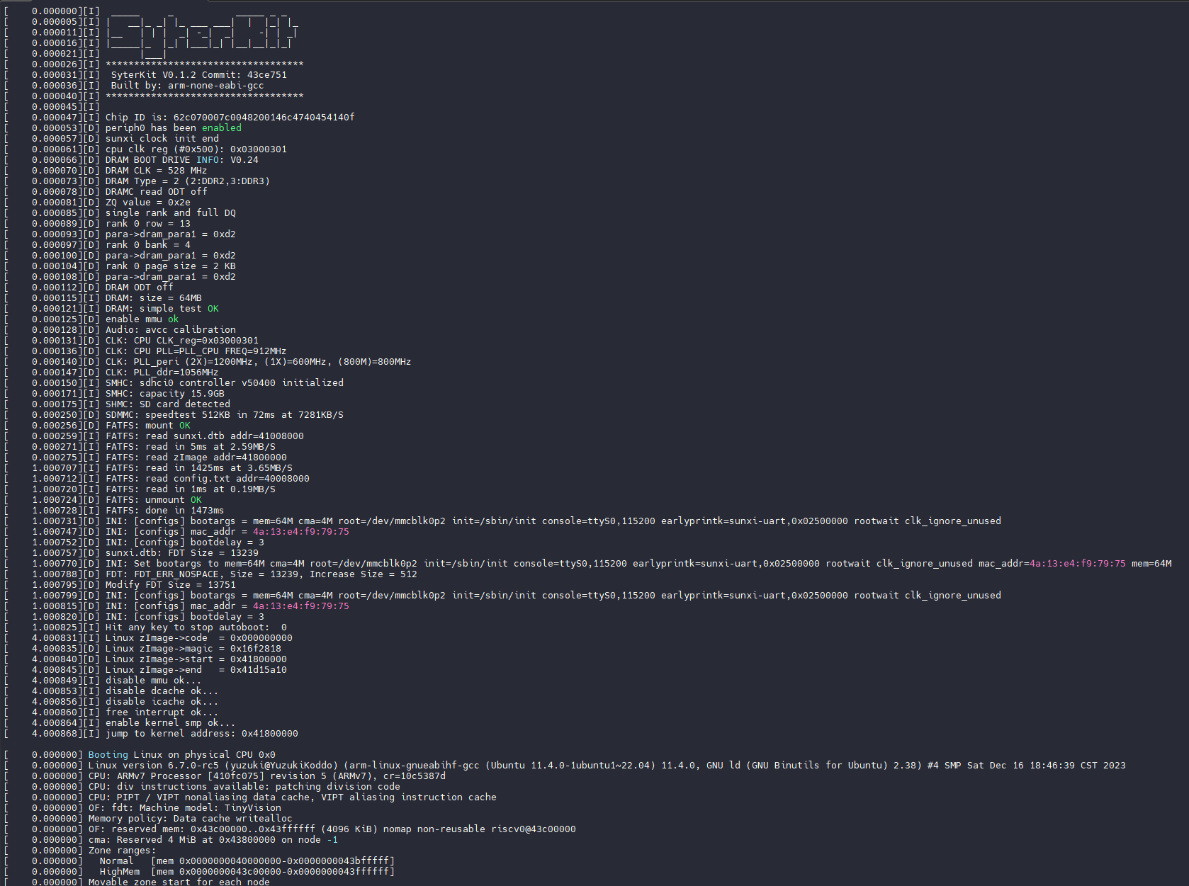 SyterKit 是一个纯裸机框架,用于 TinyVision 或者其他 v851se/v851s/v851s3/v853 等芯片的开发板,SyterKit 使用 CMake 作为构建系统构建,支持多种应用与多种外设驱动。同时 SyterKit 也具有启动引导的功能,可以替代 U-Boot 实现快速启动