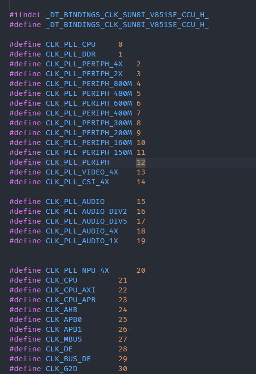 进入文件夹 include/dt-bindings/clock/ 新建文件 sun8i-v851se-ccu.h ,将 CLK 填入