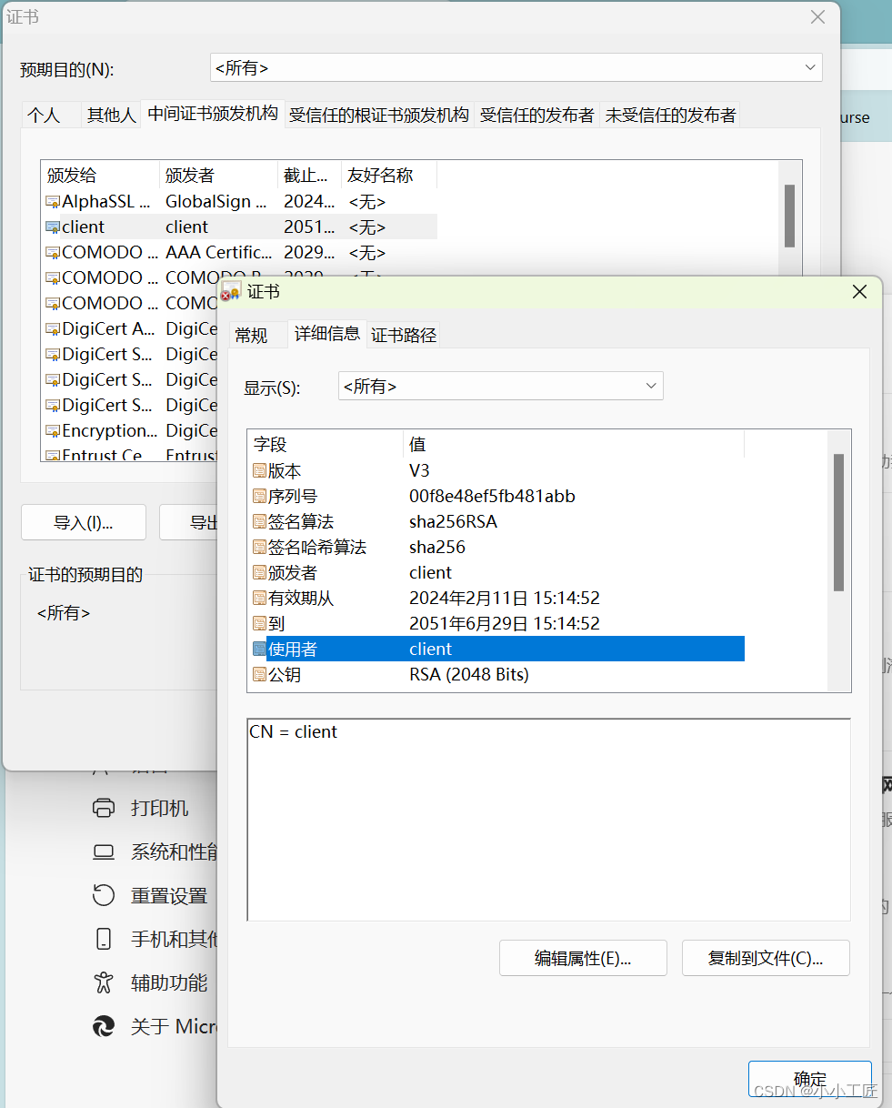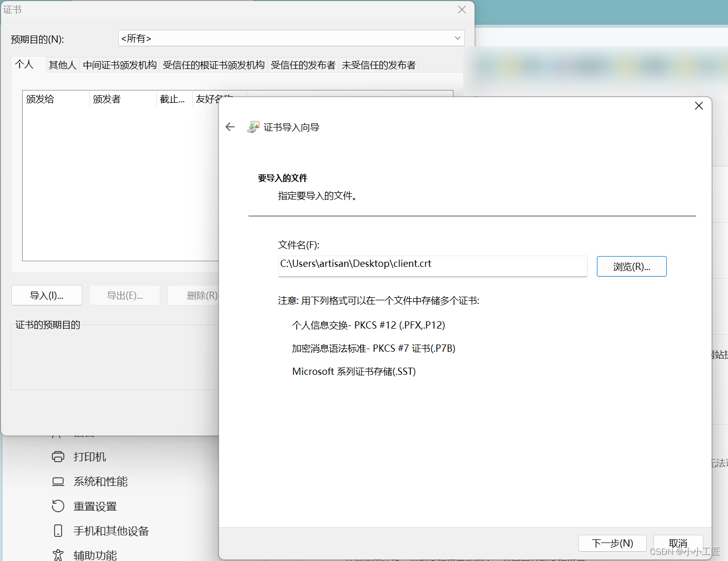 完成双向认证后,如果想在浏览器中安装客户端证书以便进行访问,可以将客户端证书和私钥导出为 PKCS#12 格式 (PFX 文件),然后在浏览器中导入该文件。
