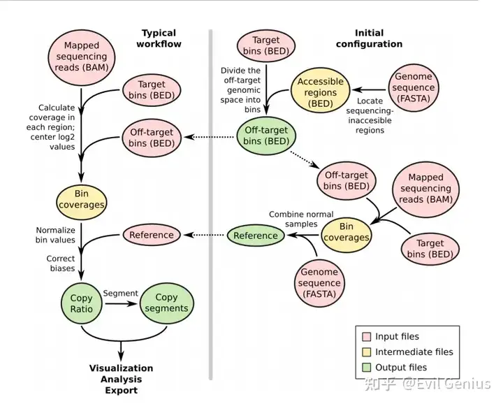 在每个基因组bin中,提取每个给定对照样本的read depths。对每个control样本执行reads深度偏差校正。在每个bin中,计算control samples中log2 reads深度的加权平均值,以标记上具有较高或较低覆盖率的bin,the spread or statistical dispersion of log2 read depths indicates bins that have erratic coverage so that they can be de-emphasized at the segmentation step. 也可以使用单个成对的control sample,或者,在没有任何control samples的情况下,可以构建一个“通用”参考,读取深度为log2,分配给所有箱子的扩展为0。在所有情况下,都可以指定一个“男性参考”,其中X染色体bin的预期读取深度是常染色体的一半。