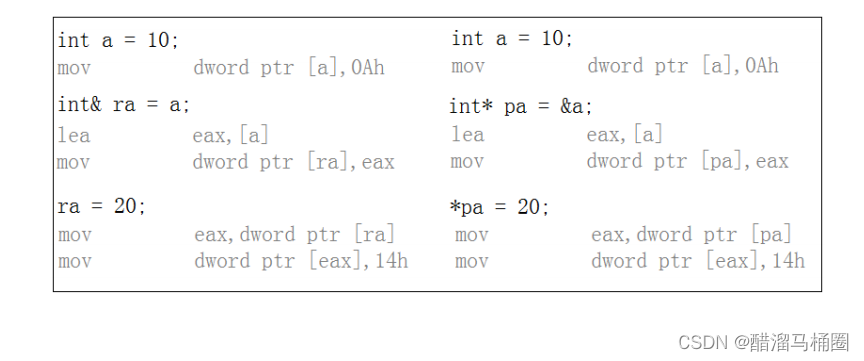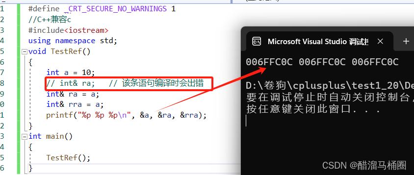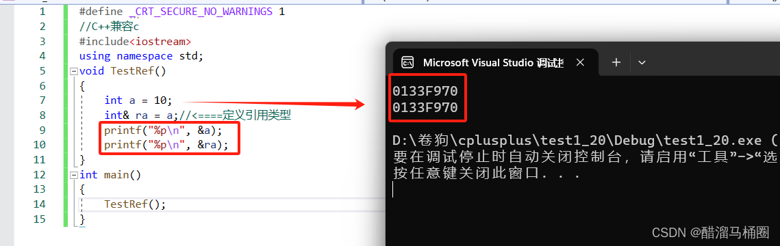 引用不是新定义一个变量,而是给已存在变量取了一个别名,编译器不会为引用变量开辟内存空间,它和它引用的变量共用同一块内存空间。比如:李逵,在家称为"铁牛",江湖上人称"黑旋风"