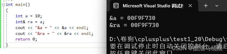 在语法概念上引用就是一个别名,没有独立空间,和其引用实体共用同一块空间