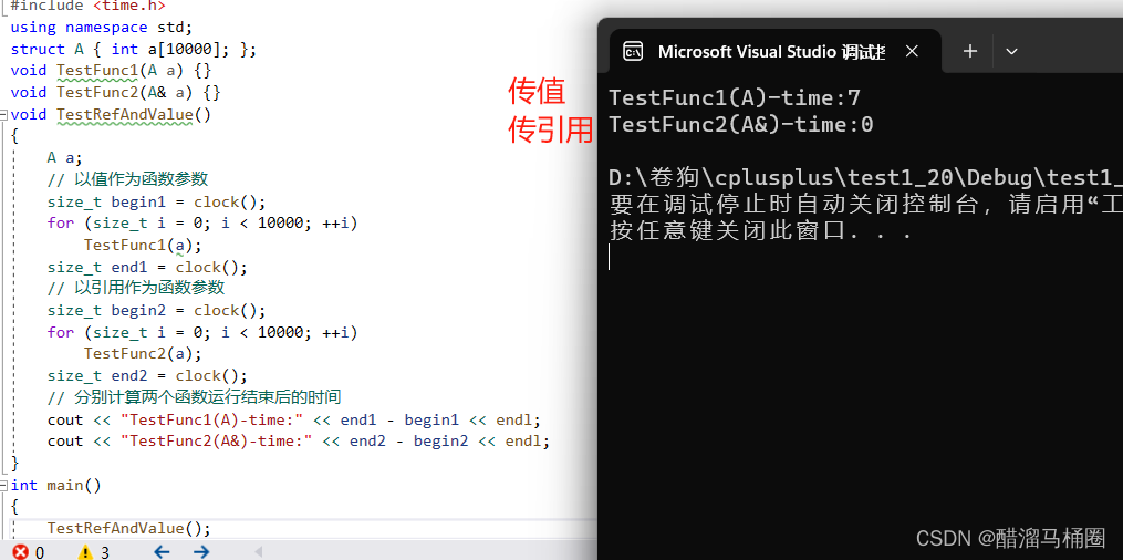 以值作为参数或者返回值类型,在传参和返回期间,函数不会直接传递实参或者将变量本身直接返回,而是传递实参或者返回变量的一份临时的拷贝,因此用值作为参数或者返回值类型,效率是非常低下的,尤其是当参数或者返回值类型非常大时,效率就更低