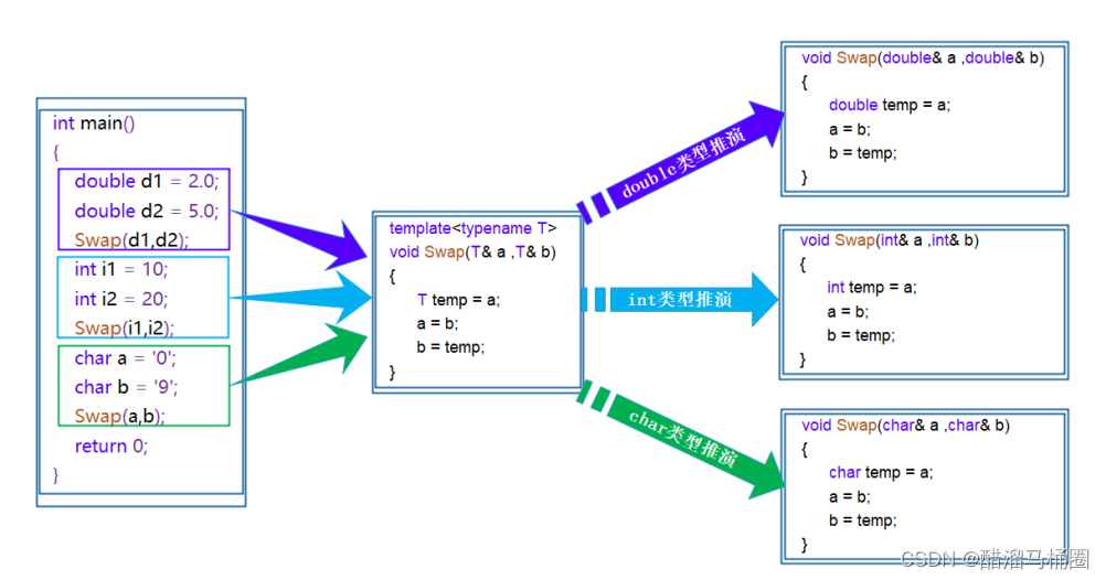 在编译器编译阶段,对于模板函数的使用,编译器需要根据传入的实参类型来推演生成对应类型的函数以供调用。比如:当用double类型使用函数模板时,编译器通过对实参类型的推演,将T确定为double类型,然后产生一份专门处理double类型的代码,对于字符类型也是如此