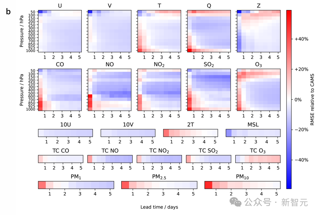Aurora在许多目标上都优于运行中的CAMS:(a) 与CAMS分析相比,Aurora预测的二氧化氮柱总量样本;(b) Aurora相对于CAMS 的纬度加权均方根误差(RMSE),负值(蓝色)表示 Aurora 更好