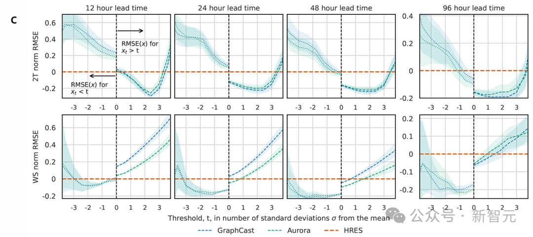 结果表明,在与分析、气象站观测和极端值进行比较时,Aurora 的表现都要优于GraphCast和IFS HRES。