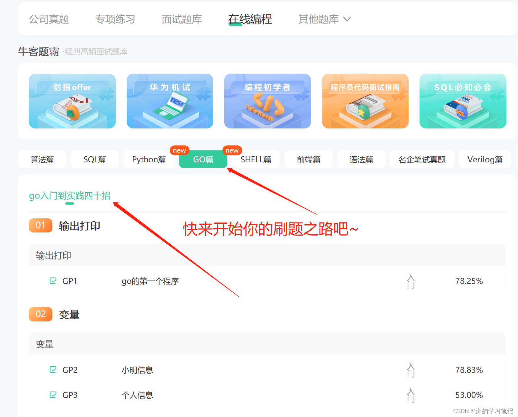 不仅仅可以刷题,你想要的这里都有~十分适合小白和初学者入门学习! 1、算法篇(398题):面试必刷100题、算法入门、面试高频榜单 2、数据结构篇(300题):都是非常经典的链表、树、堆、栈、队列、动态规划等 3、语言篇(500题):C/C++、java、python入门算法练习 4、SQL篇(82题):快速入门、SQL必知必会、SQL进阶挑战、面试真题 5、大厂笔试真题:字节跳动、美团、百度、腾讯…掌握经验不在惧怕面试!