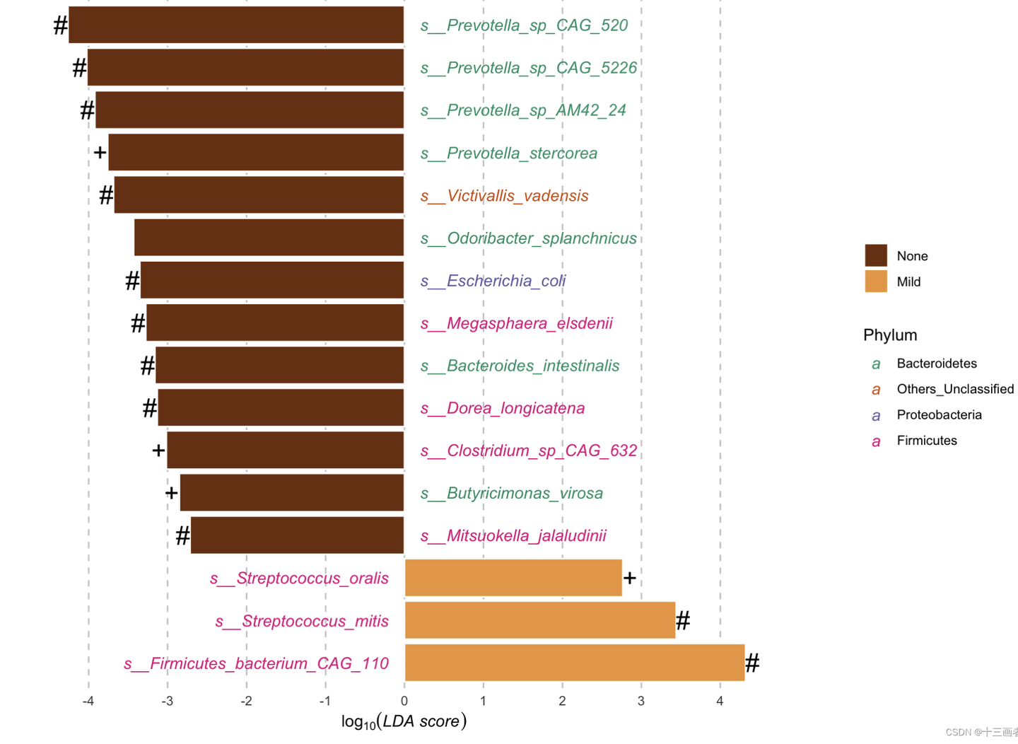 我们将以LefSe识别出的差异物种作为基准,合并另外两种方法的差异结果,最后以柱状图展示结果。