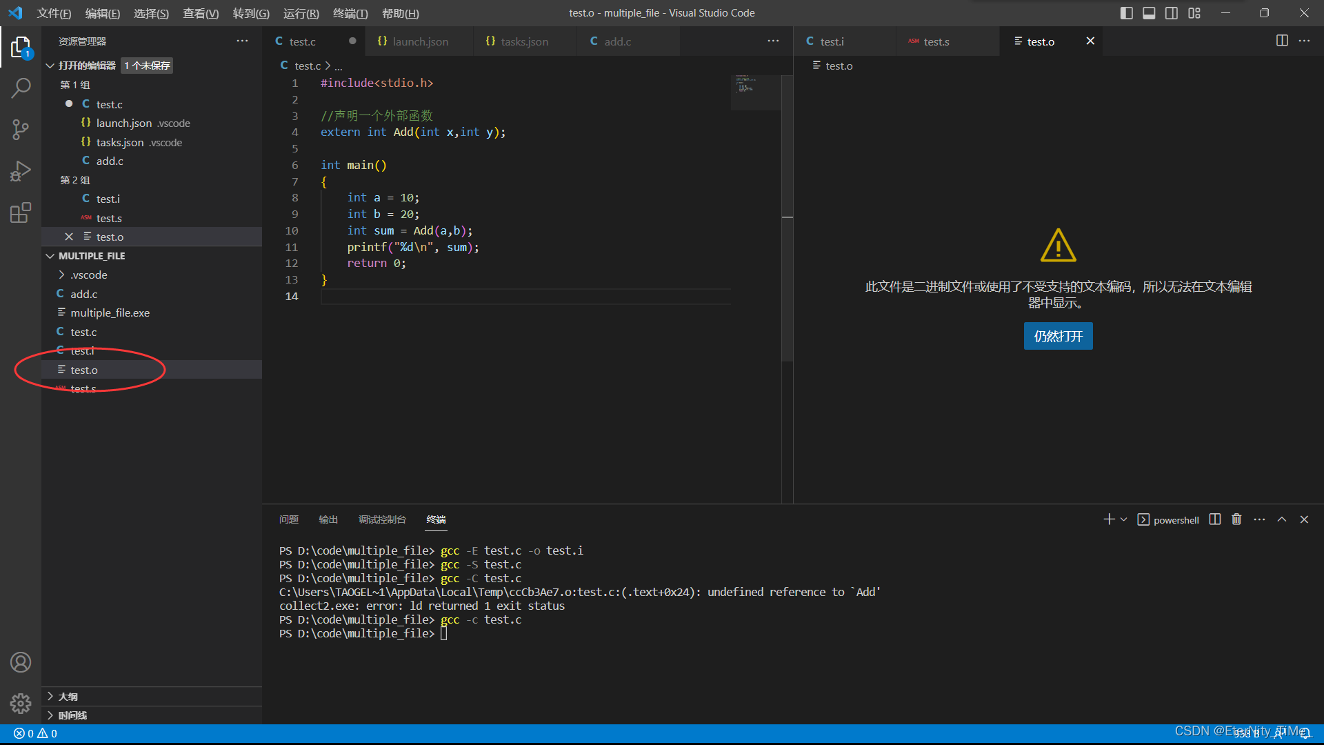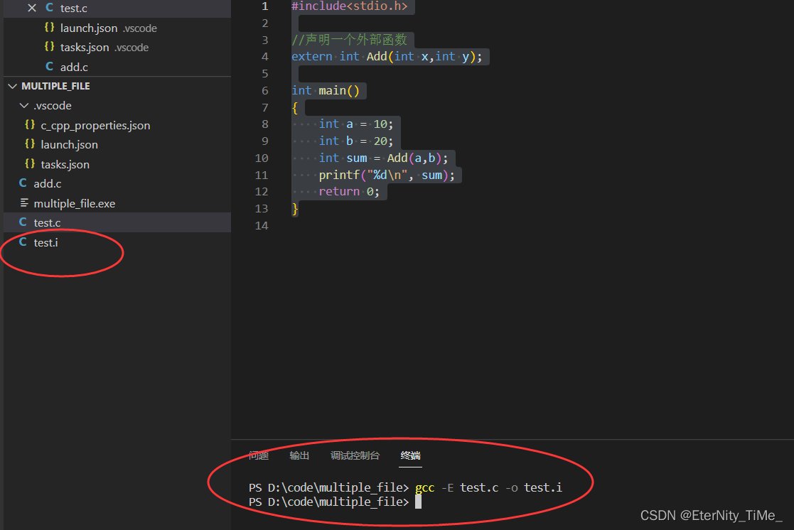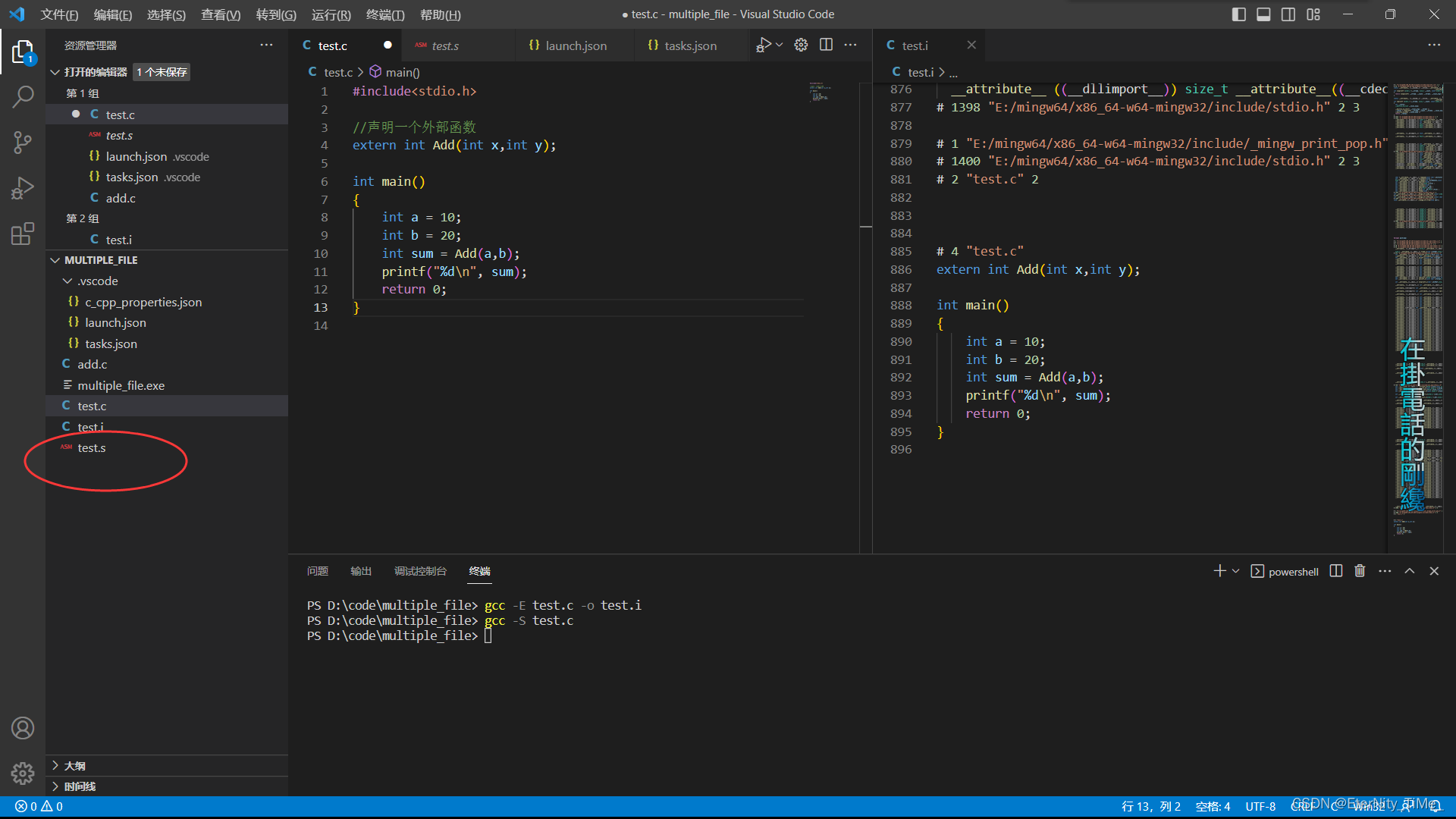 此时我们发现test.i文件已经生成好了,然后打开文件