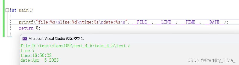 _FILE_ ------- //进行编译的源文件 _LINE_ ------- //文件当前的行号 _DATE_ -------- //文件被编译的日期 _TIME_ --------- //文件被编译的时间 _STDC_ --------- //如果编译器遵循ANSI C,其值为1,否则未定义