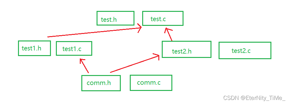 comm.h和comm.c是公共模块。 test1.h和test1.c使用了公共模块。 test2.h和test2.c使用了公共模块。 test.h和test.c使用了test1模块和test2模块。 这样最终程序中就会出现两份comm.h的内容。这样就造成了文件内容的重复