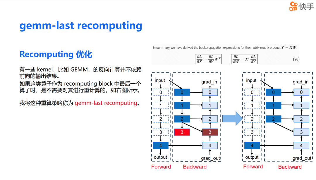 经过观察,我发现某些 kernel,例如 GEMM,其反向计算实际上并不依赖于前向传播的输出结果。例如,对于公式 𝑌=𝑋𝑊,𝑑𝑋 和 𝑑𝑊 的计算并不依赖于前向传播的结果 𝑌。如果我们将这类算子作为 recomputing block 中的最后一个算子,就无需对它们进行重计算。