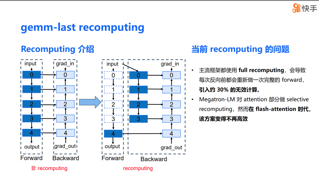 首先,主流的框架都采用了 full computing,这导致每次反向计算都会执行一次完整的 forward pass,引入了大量的无效计算。在大模型时代,这种情况是不可接受的。其次,目前的开源框架 Megatron-LM 对 attention 部分实现了 selective recomputing。然而,在 flash attention 时代,这个方案的效率已经不如以前了。