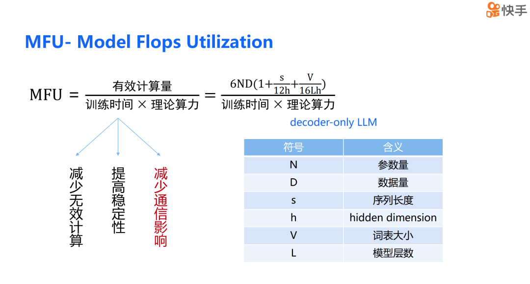 接下来,我想介绍一个衡量训练方案好坏的指标,即 MFU。MFU 的计算公式是有效计算量除以训练时间再除以理论算力。这里提到的 MFU 计算公式与之前论文发表的有所不同,原因在于当前主流的大语言模型都采用了 causal mask。对于特定的模型和特定的集群,有效计算量和理论算力都是恒定的,因此我们的目标是通过减少训练时间来提升 MFU。