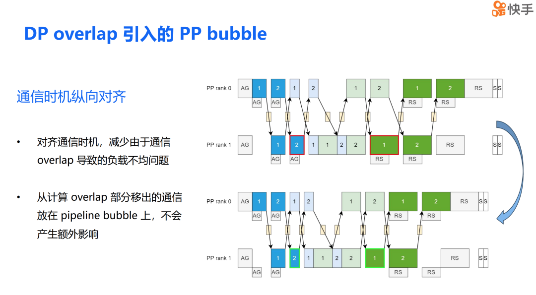 DP overlap 引入的 PP bubble 问题。在前面,我们讨论了通信对计算效率的影响。如果我们模仿 ZeRO 的调度策略,由于 overlap 计算的时间会长于 none overlap 计算的时间,这种负载不均衡会导致 PP bubble 的产生。即图中的 Micro batch 2 的前向传播和 Micro batch 1 的反向传播较长的现象,这展示了负载不均的情况。我们提出的解决方案是通信时机的纵向对齐,这样可以极大地缓解 PP bubble 的问题。同时需要强调的是,从计算 overlap 部分移出来的通信都被放在了 PP bubble 上,因此它不会产生任何额外的影响。这种策略有助于平衡负载,减少因通信和计算不匹配而产生的效率损失。