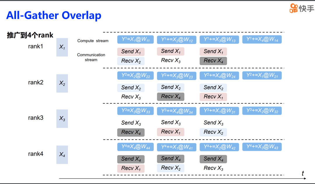 然后我们可以将这种策略推广到四个 rank 的场景中。为了简化表述,我们将计算的 stream 都合并到了一起。对于 all-gather overlap GEMM,我们会特别关注第一个 rank。第一步,我们使用自己持有的那部分输入来进行计算,同时将自己持有的内容也发送给其他 rank,并接收其他 rank 中持有的那部分输入。接下来的第二步、第三步、第四步都是按照相同的原理进行。通过这种方式,我们就可以得到一个 all-gather 的 overlap 流程。这样,每个 rank 都在进行本地计算的同时,与其他 rank 进行数据交换,实现了计算与通信的重叠。这种策略可以有效地减少等待时间,提高资源利用率,从而提升整体的并行计算效率。