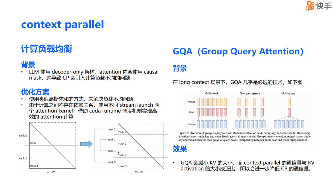 结合 CP 还有一些额外的好处。GQA(Grouped Query Attention)是在长上下文场景下几乎必选的技术。与原来的 Multihead attention 相比,GQA 将多个 query 作为一个 group,每个 group 对应一个 K 和 V。可以发现,GQA 可以极大地减少 KV activation 的大小。正如之前提到的,CP 的通信量与 KV 的 activation 大小成正比。因此在 GQA 的场景下,我们可以进一步减少 CP 的通信量,这是结合使用 CP 和 GQA 技术的一个显著优势。