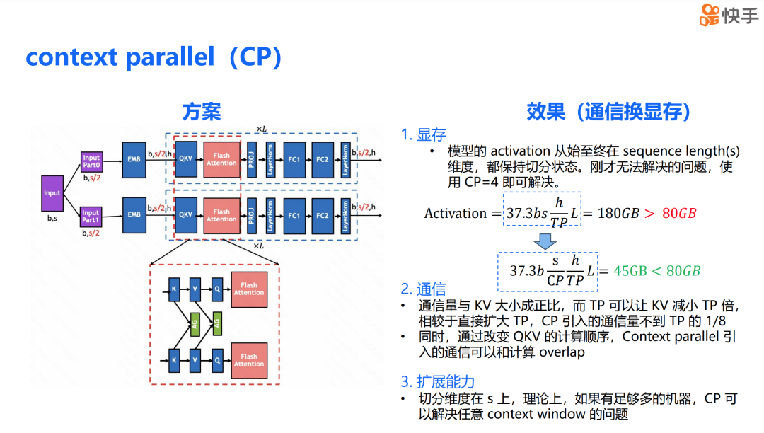 在 CP 场景下,整个模型的 activation 从始至终都在 s 维度上保持着切分状态。之前无法解决的问题,通过 CP=4 就可以解决。我们可以计算这个方案的通信开销,CP 引入的通信开销仅有 KV 前向时的 all-gather 和反向时的 all-gather 以及 reduce-scatter。同时,我们改变了 QKV 的计算顺序,使得 K 的通信可以与 V 的计算重叠,V 的计算可以与 Q 的计算重叠。因此,我们可以得出下述两个结论。