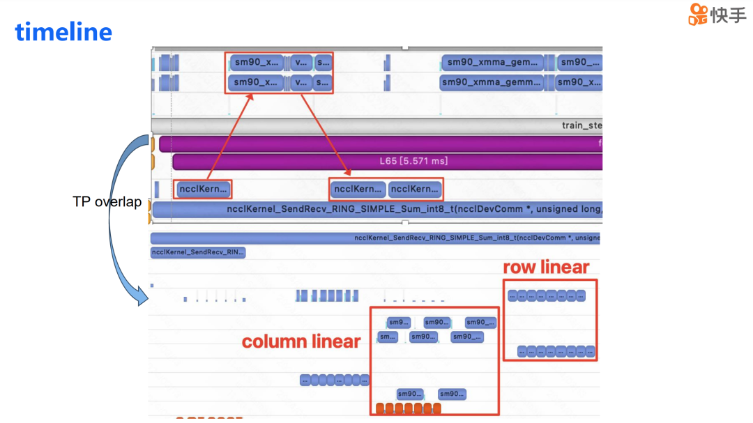 下图展示了实现 TP overlap 后的 timeline,我们可以看到 TP 的通信和计算重叠在了一起。同时,我们进行了两项优化措施:第一项是使用了 peer-to-peer memory copy,以此来减轻通信对 SM 的消耗。第二项优化是将计算分散到不同的 stream 上,这样计算也可以实现部分的重叠。