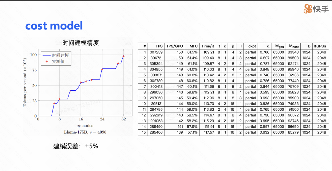 在 175b 的案例中,我们建模的预测值和实测值之间的误差控制在 2% 以内。在实际使用过程中,我们的成本模型的误差与实测值的对比也不超过 5%,其中大部分误差来源于网络的不稳定性。下图右边展示了我们的成本模型给出的参数配置表。通常情况下,搜索完成后,我们可以根据 MFU 的前 5 名进行实际测试,最终得到我们的训练配置。这种方法大大提高了参数调整的效率和准确性。