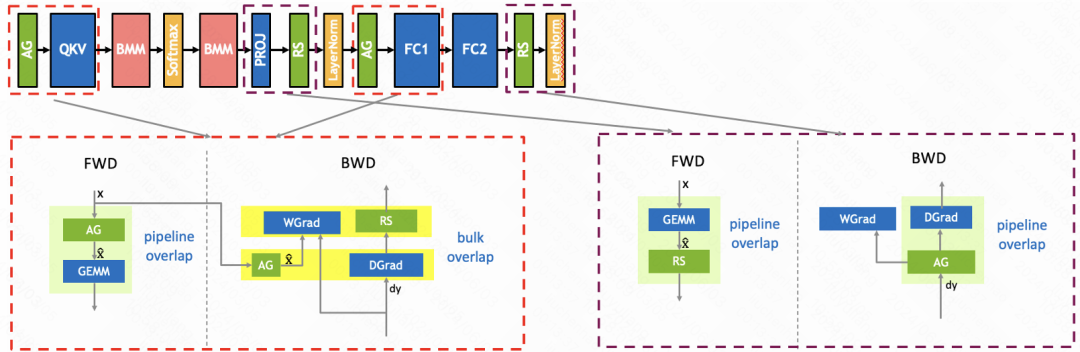 在计算过程中,实际上穿插了两个通信操作,一个是 f,一个是 g。其中,f 在前向传播时对应 all-gather 操作,在反向传播时是 all-gather 加 reduce-scatter。而 g 在前向传播时是 reduce-scatter,在反向传播时是 all-gather。我们后续的 TP overlap 策略就是围绕这些通信操作来进行的。