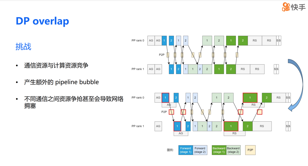 DP overlap 的方案在理论上看起来非常吸引人,但实际应用中,我们真的能显著提升训练效率吗?在进行 DP overlap 优化时,我们遇到了三个主要问题。首先,是通信和计算资源之间的竞争问题。当通信和计算操作同时进行时,它们会争夺有限的硬件资源,这可能会影响整体的系统性能。其次,在混合并行场景下,DP overlap 还可能带来 PP bubble 的问题。第三,不同通信资源的争抢还可能导致网络拥塞。