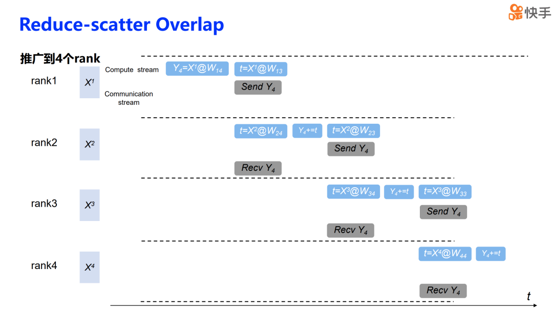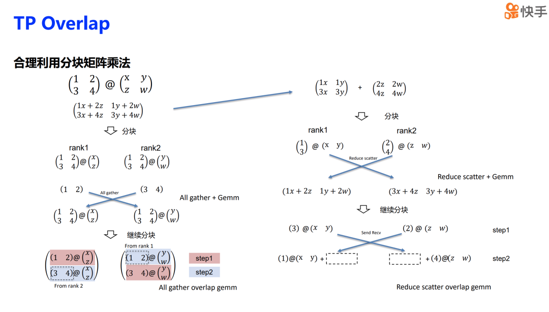 在执行 step 1 计算的同时,我们可以进行 send 和 receive 操作,将自己持有的那一部分输入数据发送给另一个 rank。接下来执行 step 2,这样通信就与 step 1 的计算重叠起来了。同时,我们还可以通过分块的方式拆分矩阵,也就是将矩阵分为左块和右块。分块的结果可以先计算出部分结果,然后再进行 reduce-scatter 操作,这也是之前介绍的 reduce-scatter+GEMM 的计算流程。