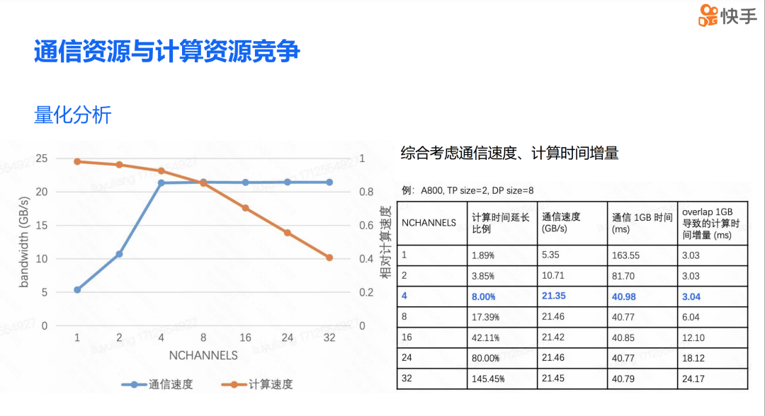 我们来谈谈通信与计算之间的资源竞争问题。最突出的问题是 SM 资源的竞争。简单来说,通信会占用一部分 SM 资源,这进而会影响计算的性能。然而,我们在进行性能分析后发现,用于计算的 SM 数量与通信占用的 SM 数量并不匹配。