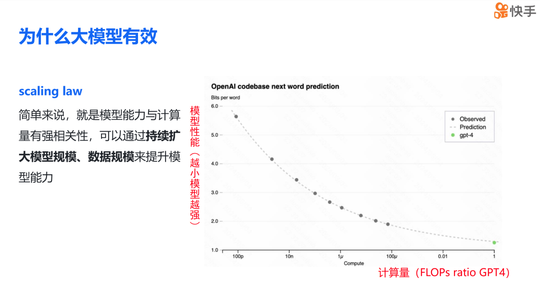 那我们为什么需要将模型扩展到如此规模?或者说,为什么模型越大效果越好呢?大模型持续扩大规模会变强的理论基础是 scaling law。接下来展示的这张图来自 OpenAI GPT-4 的技术报告,scaling law 简单来说就是模型的能力与计算量有强烈的正相关性。因此,我们可以通过不断增加模型规模和数据规模来提升模型的能力。