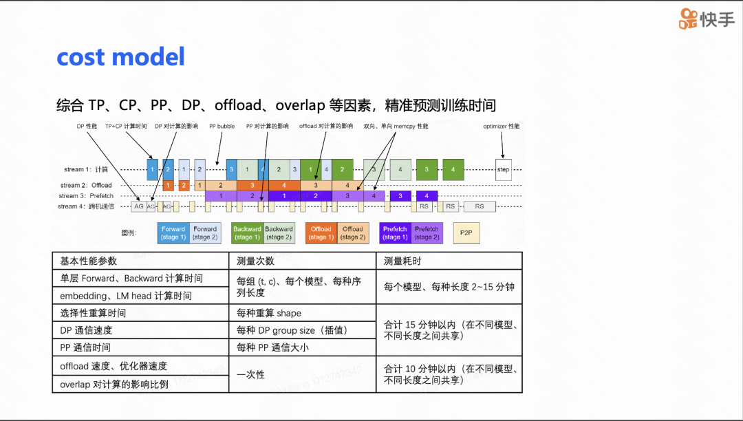 接下来是 cost model(成本模型)的介绍。在进行大模型训练时,参数调整是一个非常痛苦的过程,因为模型有大量的参数,并且这些参数之间相互影响,比如 TP、CP、DP 的大小,以及 offload 的比例,还有网络设置中的 CTS。如果对所有参数都进行实际运行测试,将会消耗大量的计算资源。然而,如果不进行实际运行,仅仅通过比例和一些基于 FLOPs 理论算力的简单折算来预测,会导致预测极其不准确。因此,这样的成本模型是不可行的。