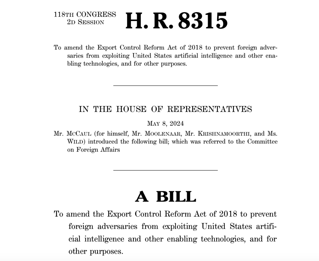 《ENFORCE 法案》由美国众议员共和党议员迈克尔·麦考尔(Michael McCaul)、约翰·莫伦纳尔(John Molenaar)、马克思·怀斯(Max Wise)和民主党议员拉贾·克里希纳莫西(Raja Krishnamoorthi)提出。其主要目标在于,通过强化美国商务部的权力,使其能够更加便捷地对 AI 模型实施出口管制,并进一步限制美国与外国实体在开发可能威胁国家安全的 AI 系统方面的合作。