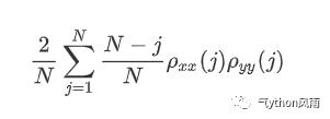 这里 N 是样本大小,ρXX (j) 和 ρYY (j) 分别是两个采样时间序列 X 和 Y 在时间滞后 j 处的自相关。