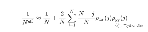 是一种加权系数,用于调整每个时间滞后的贡献,\rho_{xx}(j)\rho_{yy}(j) 表示X和Y在时间滞后j处的自相关系数的乘积。 通过估计有效样本量,我们可以更准确地考虑到自相关性的影响,并进行统计推断和假设检验等分析。