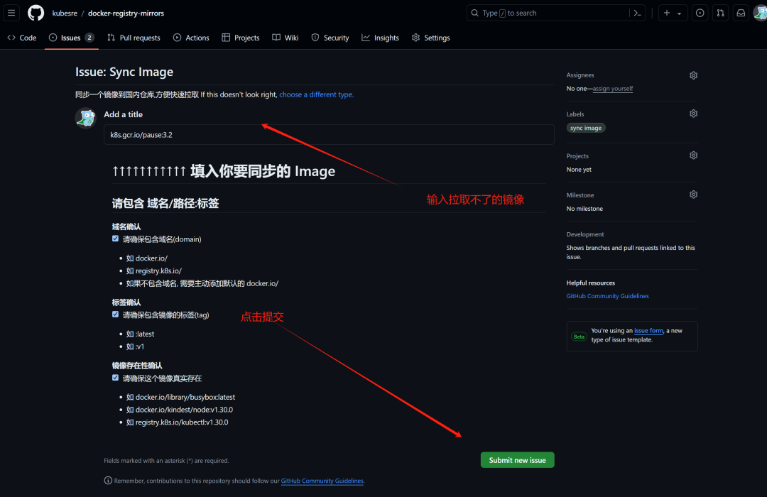 那我们提个Issue同步一下:浏览器输入:https://github.com/kubesre/docker-registry-mirrors