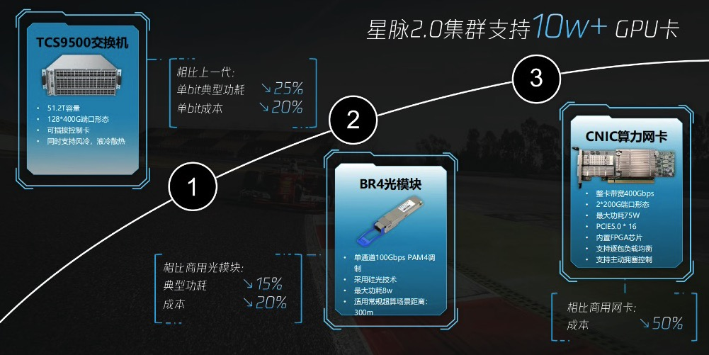 为了解决 10 万卡集群的性能瓶颈问题,需要实现端和网的协同。因此,除了商业网卡,星脉也首次引入了自研的算力网卡,与自研的软件系统相结合,大幅提升整体性能。