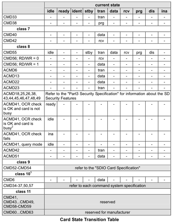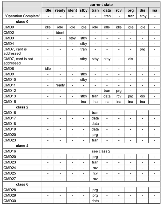 下方表格根据接收到的命令定义了卡的状态转换。表中的状态名是命令执行后的下一个状态。“-”表示该命令被视为非法命令。此外,命令是否可执行取决于命令类(ccc)。