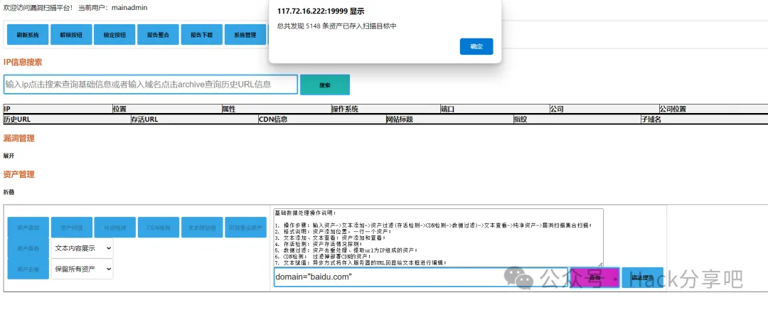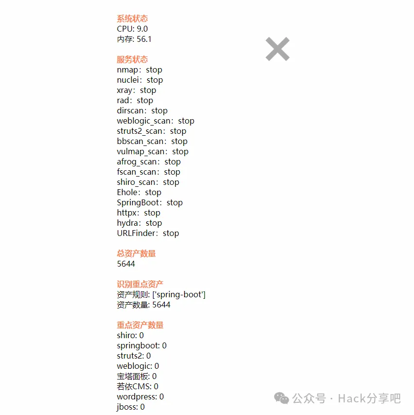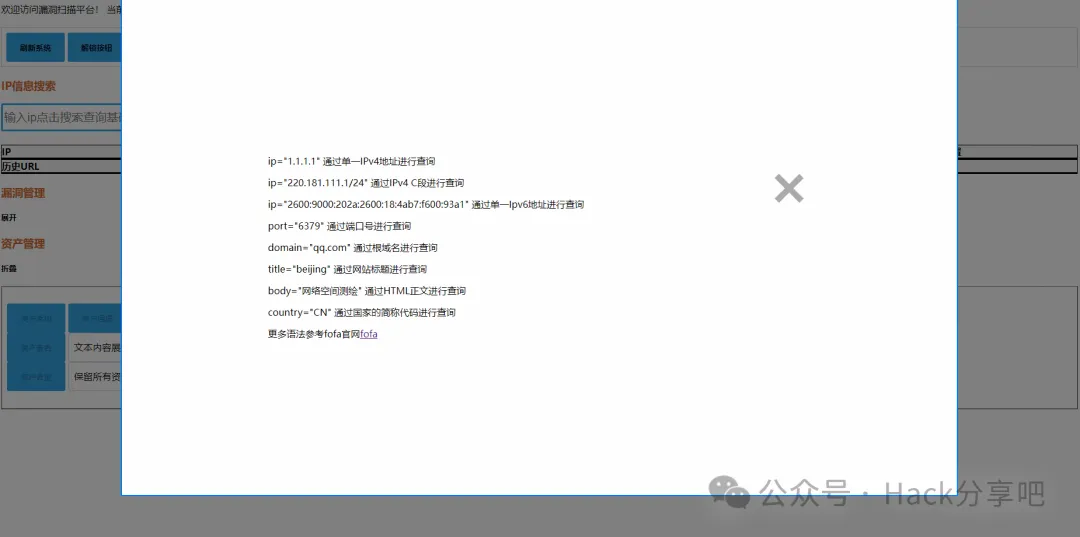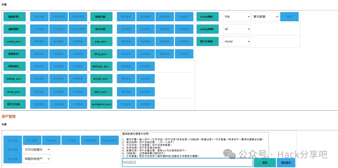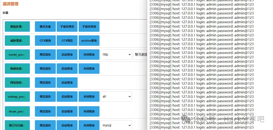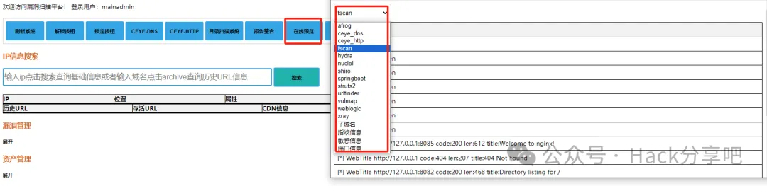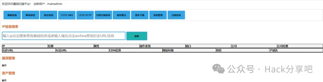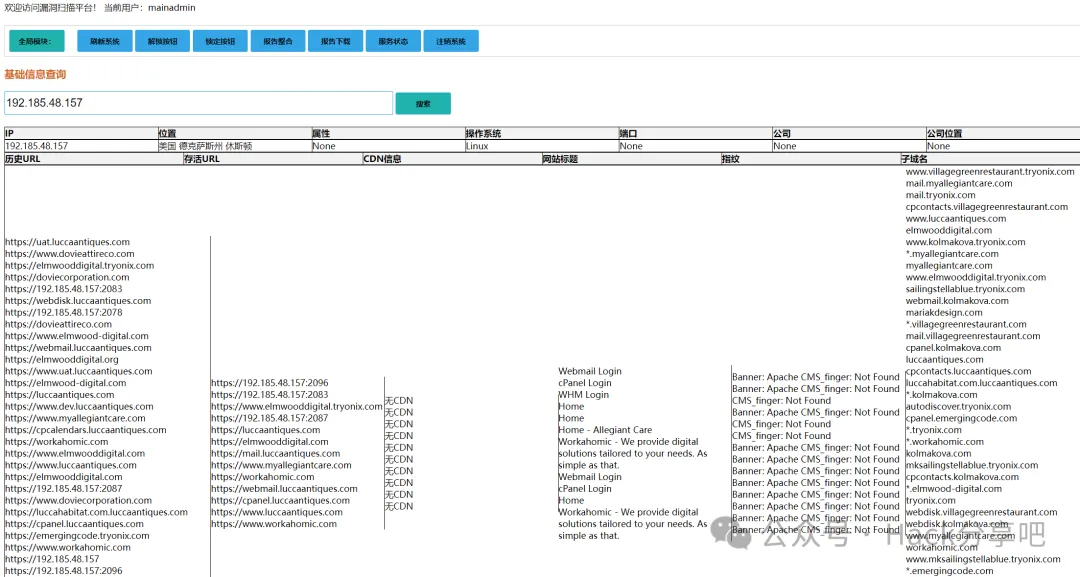 info_scan是@huan666师傅实战沉淀几年的一款自动化漏洞扫描系统,包括IP基础信息探测模块(位置、属性、操作系统、端口、绑定的域名、公司名称、公司位置信息、网站标题、CDN信息、绑定网站指纹、子域名),漏洞扫描模块,(weblogic、struts2、nuclei、xray、rad、目录扫描、js链接扫描、端口扫描、调用威胁情报抓取历史绑定url、网站指纹、信息泄露、vulmap、afrog、fscan、DNS日志、shiro、springboot、服务弱口令扫描、识别重点资产),资产管理模块(资产发现、资产展示、CDN检测、存活检测、资产回退、重点资产识别),单个扫描模块报告支持在线预览,总报告支持下载和预览。