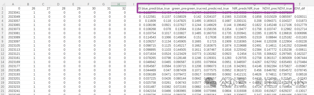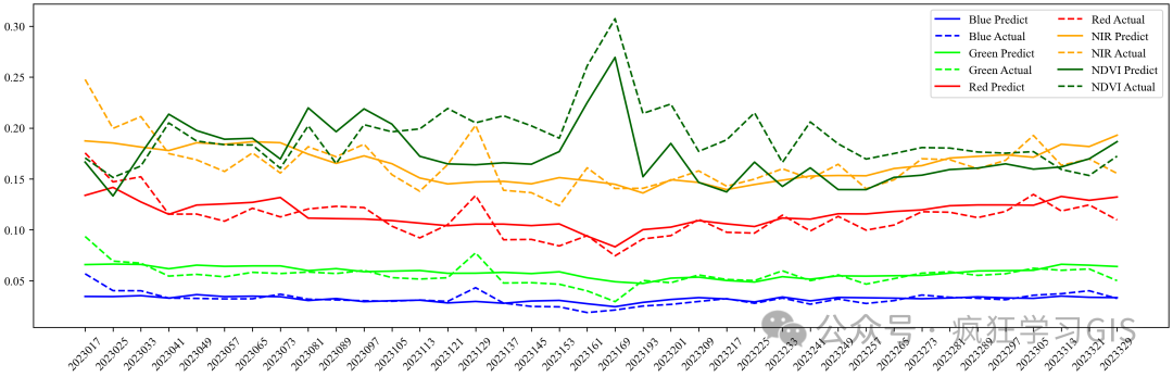 接下来,我们读取.csv格式文件并选择指定范围的数据。df = pd.read_csv(csv_file)表示读取.csv格式文件并创建DataFrame,而后通过selected_data = df.iloc[idx_start : idx_end]选择指定索引范围的数据,也就是处于指定行数内的数据;time就是第一列数据,也就是一个循环内的时间序列,time_x则用于显示图片的x轴刻度——之所以需要这个,是因为我这里希望用字符的形式来表示图片中x轴的刻度(如果用数字的话,那么相当于一年365天对应的x轴长度都是固定的365个刻度;而对于时相缺失比较多的循环,这样绘制出来的图不好看)。随后,分别提取本文开头图片中紫色框内的数据,其分别表示蓝色、绿色、红色、近红外和NDVI的预测值和实际值。