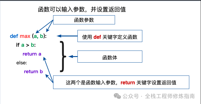 关键字参数:使用关键字参数来确定传入的参数值,并且可以改变参数的顺序,关键字参数必须写在位置参数后面。例如,func(arg1,arg2),调用 func(arg1="全栈工程师修炼指南",arg2="Python")