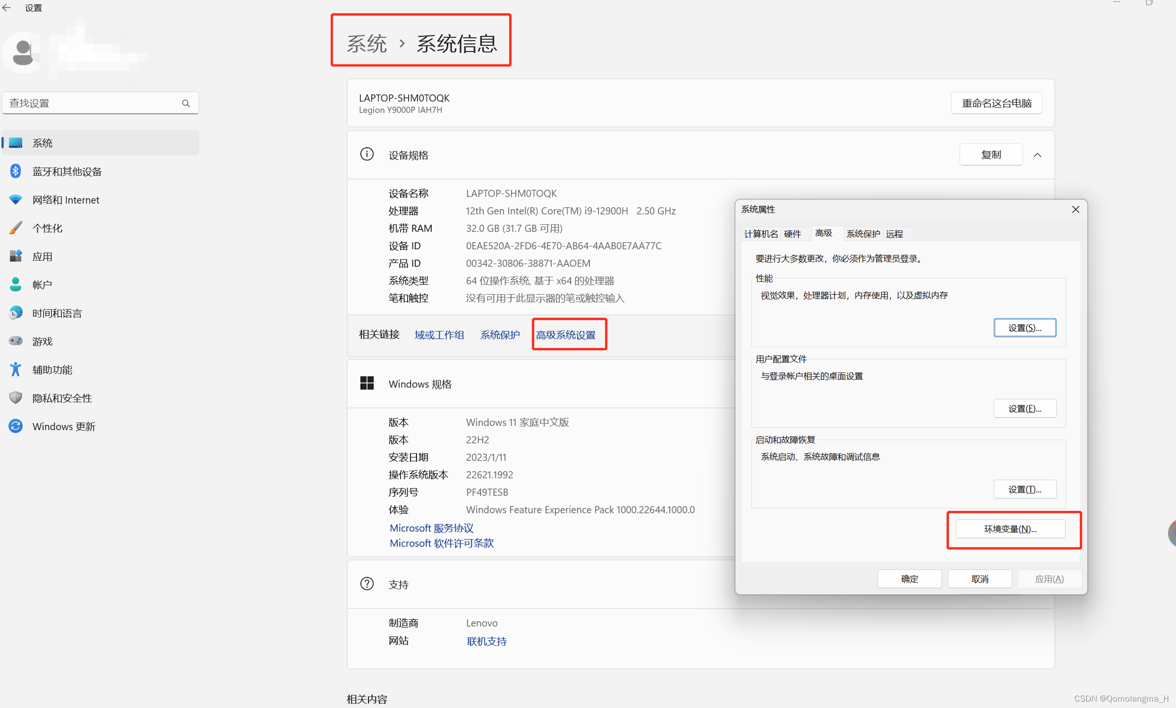 设置——系统——系统信息——高级系统设置——环境变量