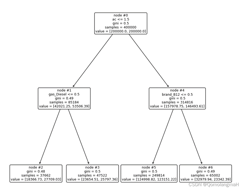 我们使用决策树分类器模型进行训练(设定树的最大深度为2,使用平衡的类权重,并默认使用基尼系数检验准确度)。