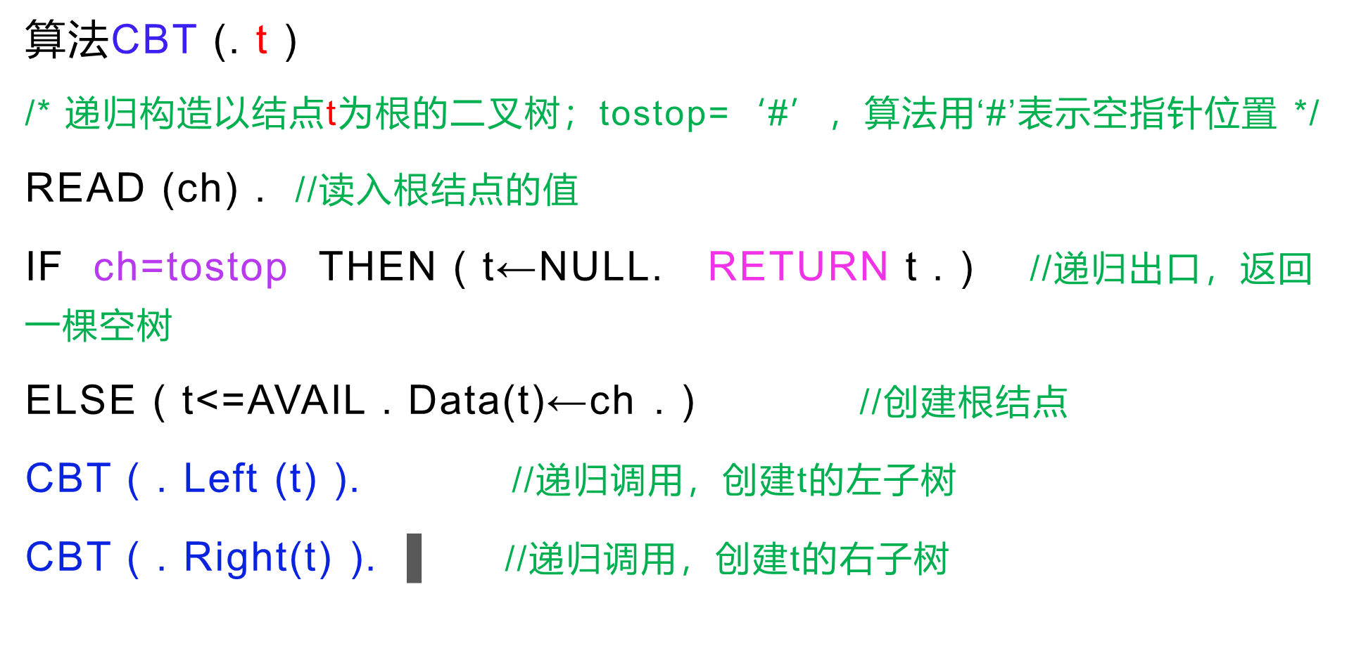 由二叉树的遍历,很容易想到用遍历方法去创建二叉树。我们考虑从先根遍历思想出发来构造二叉树。 方法:输入当前被创建结点的数据域的值,如果不空,申请空间用指针指向,然后对数据域进行赋值,再递归对该结点的左右指针域进行赋值,这就是先根创建过程。当输入为空,则算法返回一个空指针(即空树。递归出口)。