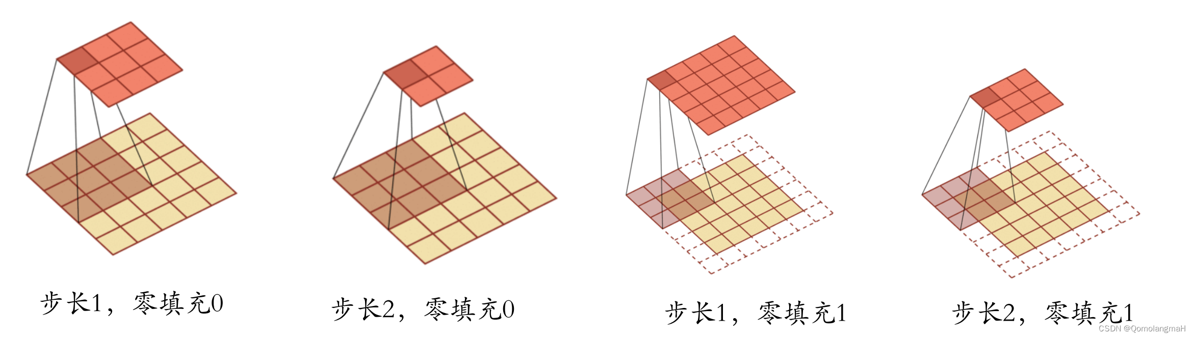 在卷积的标准定义基础上,还可以引入卷积核的滑动步长和零填充来增加卷积的多样性,可以更灵活地进行特征抽取: