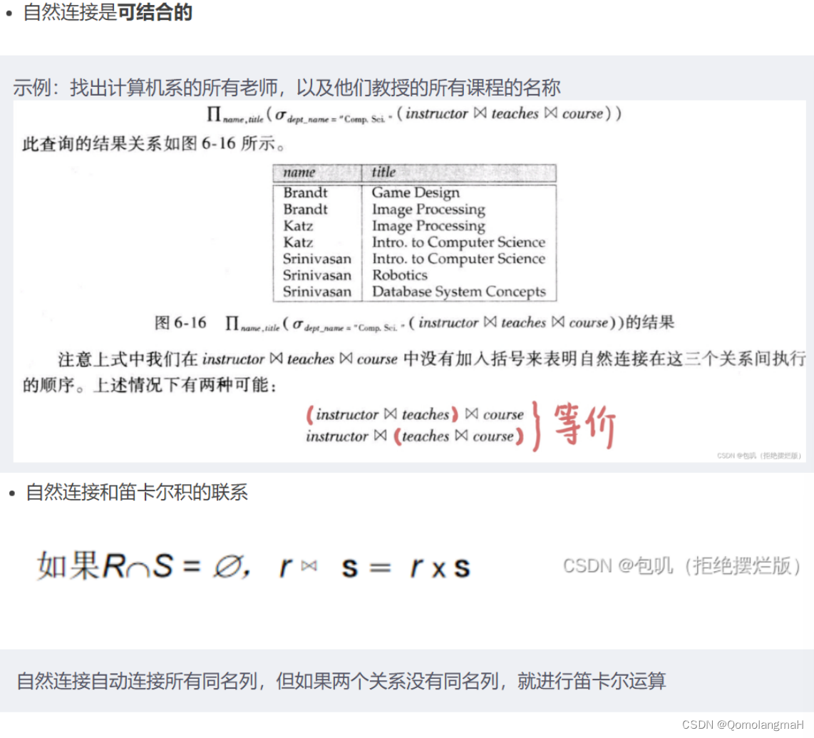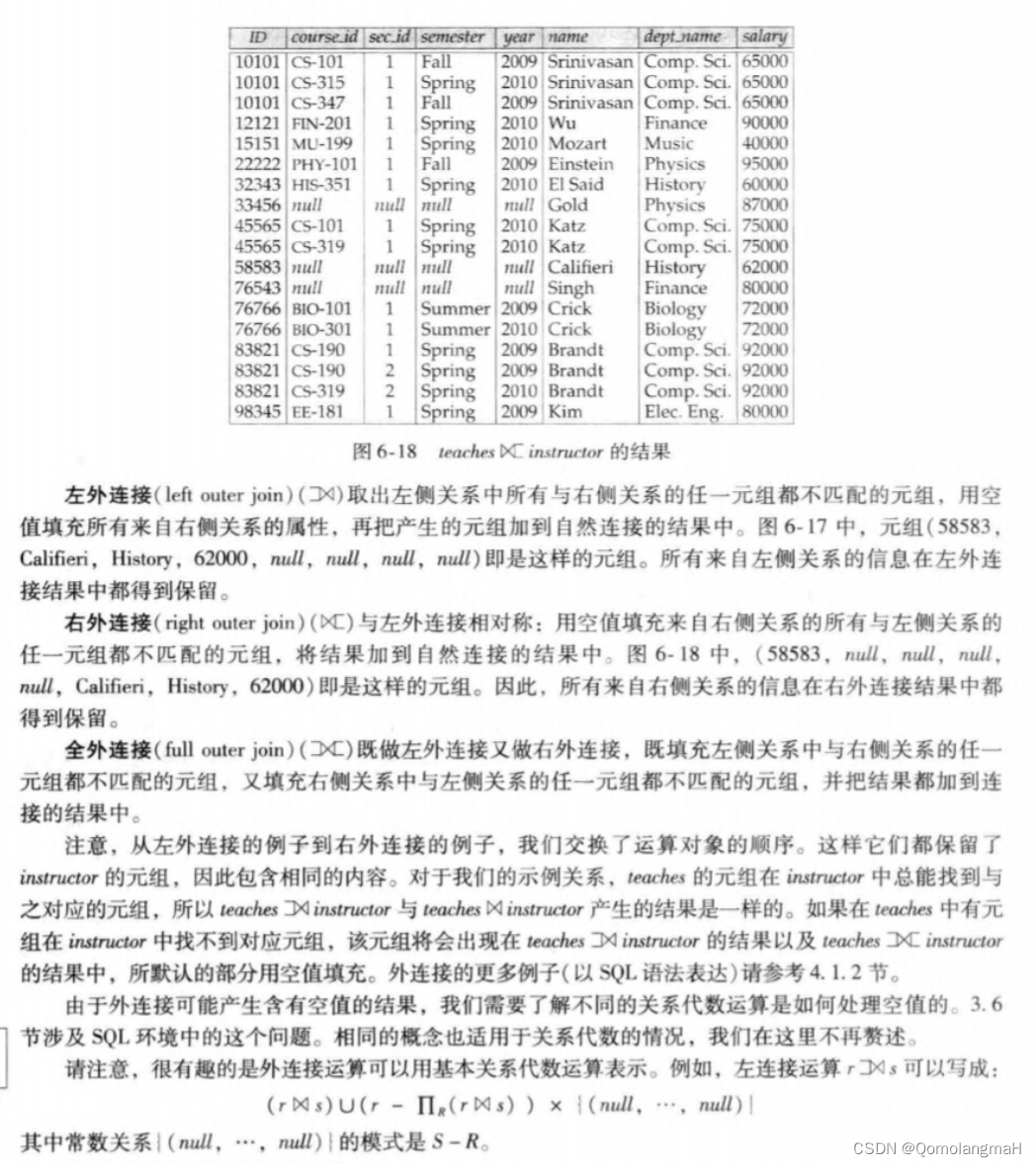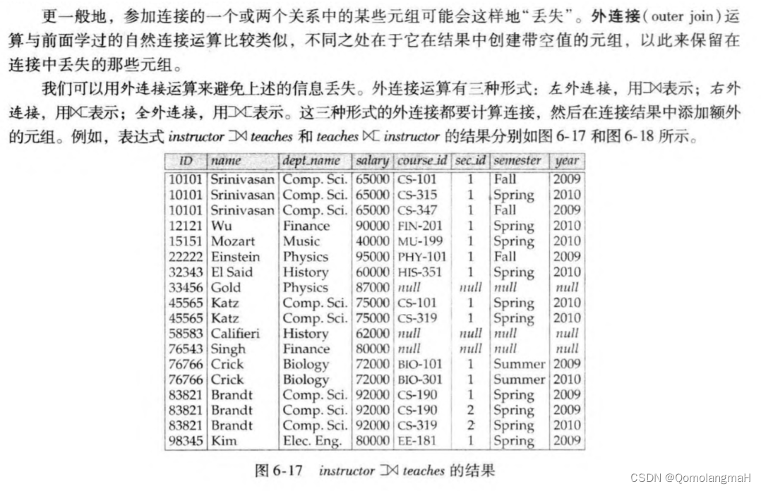 外连接可在自然连接基础上创建带空值的元组,避免元组的丢失情况。例子如下: