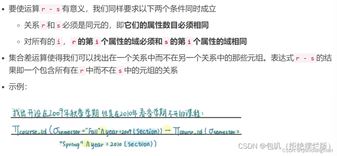 用—表示的集合差(set-difference)运算使得我们可以找出在一个关系中而不在另一个关系中的那些元组。表达式r-s的结果即一个包含所有在r中而不在s中的元组的关系。