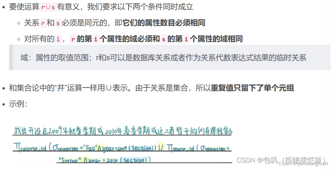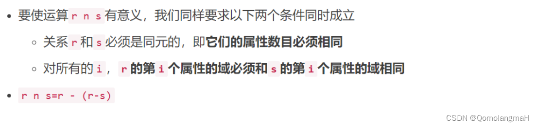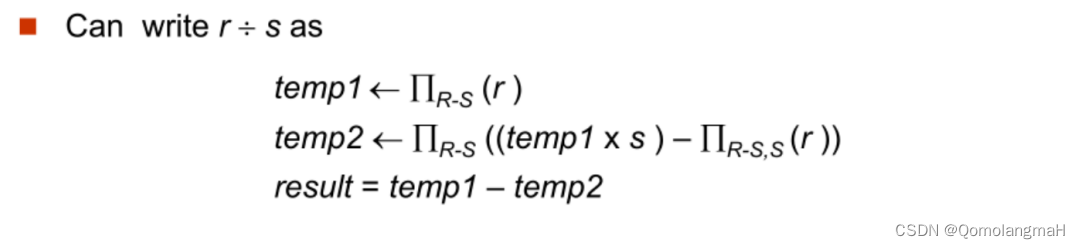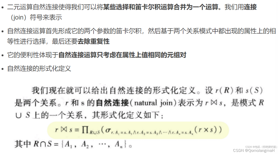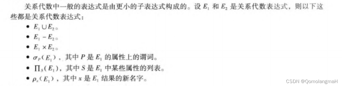选择、投影和更名运算称为一元运算,因为它们对一个关系进行运算,另外三个运算对两个关系进行运算.因而称为二元运算。