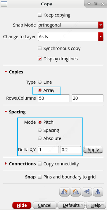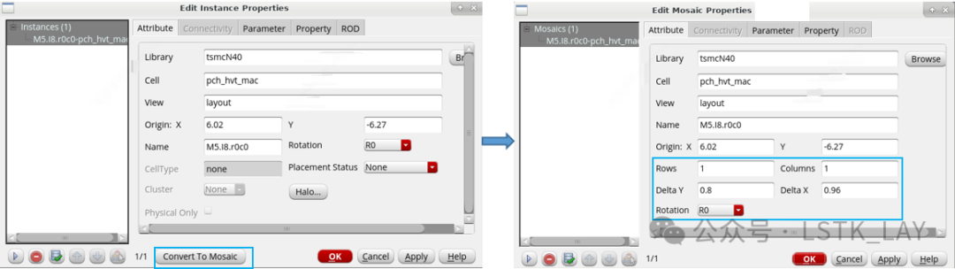 方法2:在layout界面,选中需要阵列的元器件,直接q出属性界面,点击Convert To Mosaic,然后对于设置相关参数即可。菜单栏相关命令如下:Edit—Convert—To...