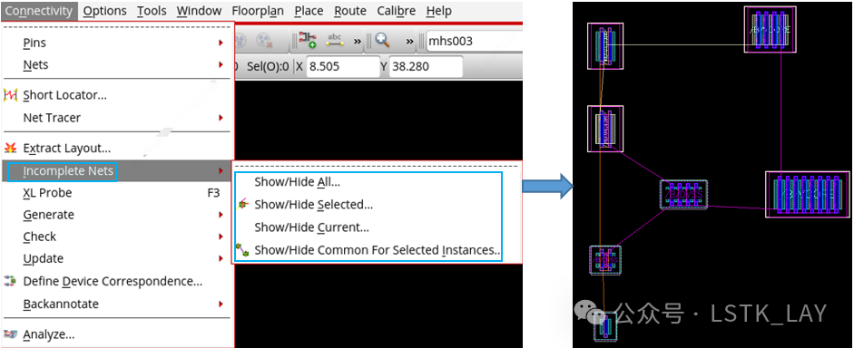 可以提供对应net的飞线提示,并且支持灵活指定单根或多根net网络飞线显示与不显示,方便连线,亦能提高LVS通过效率。(多数情况下一板见笑脸😊)相关操作如下图: